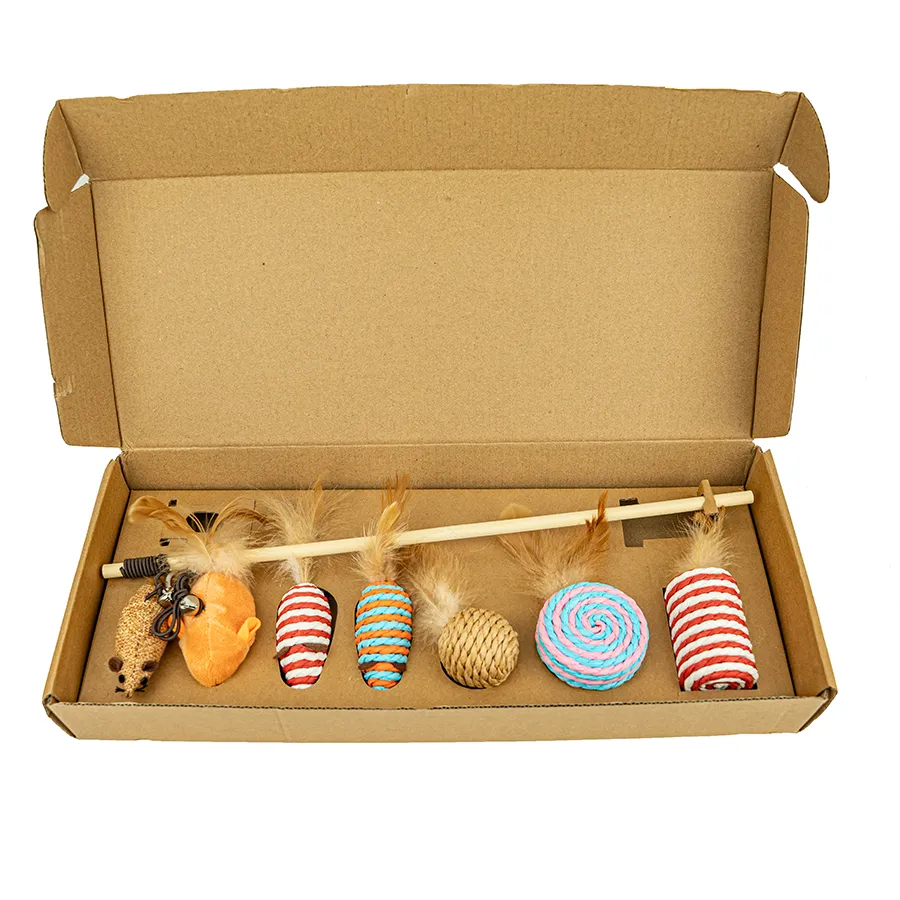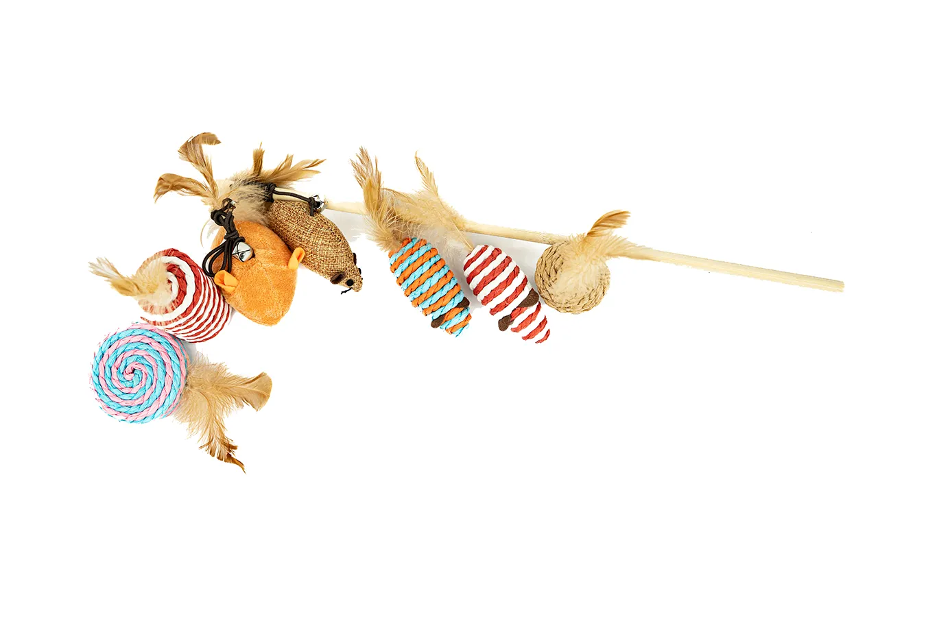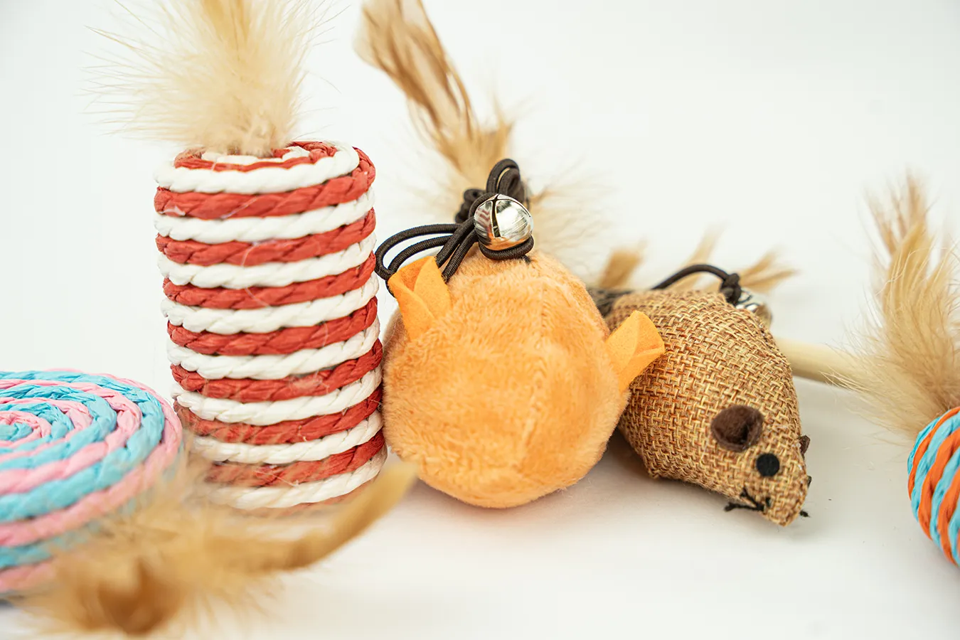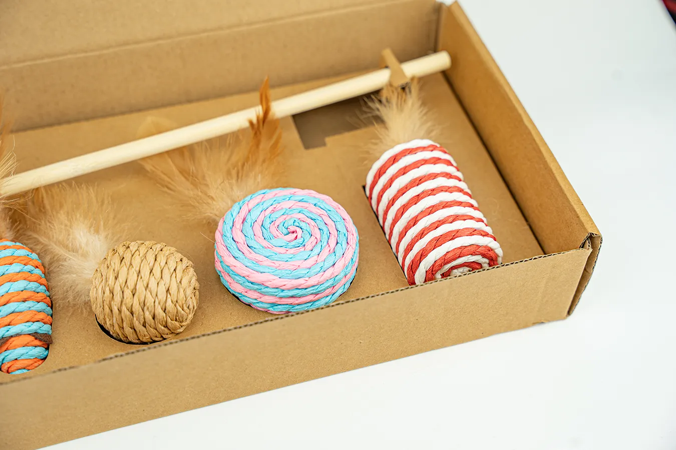 Ciekawość naszych przyjaciół zostanie zaspokojona dzięki ekologicznemu zestawowi zabawek od PanaKota składającemu się z 7 elementów.  Znajdziecie wsród nich myszki z piórkami, kulki oraz wędkę z myszką i dzwoneczkiem.