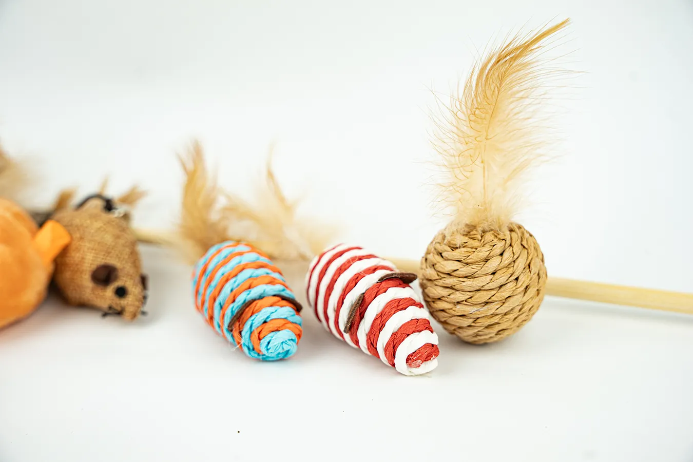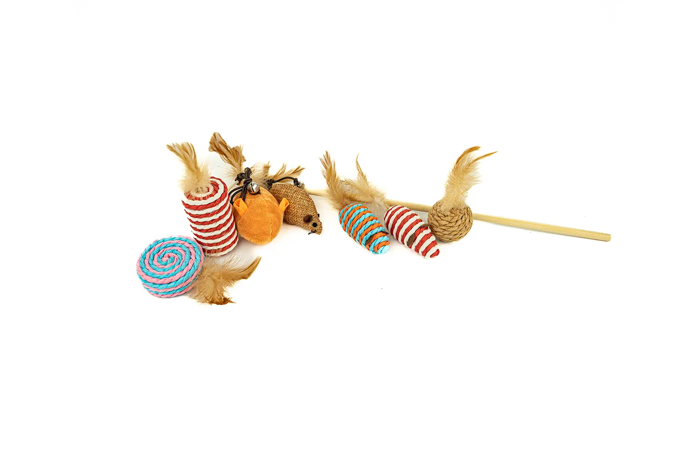 Zestaw 7 sztuk ekologicznych zabawek – myszki dla kota + wędka